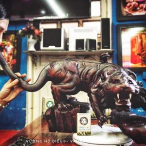 Siêu Điếu Hổ Vương® được chế tác nguyên khối từ gỗ hương Gialai, đục chạm tỉ mĩ bởi những nghệ nhân lão làng, đường nét sắc sảo, lôi cuốn, thu hút những cặp mắt tò mò.